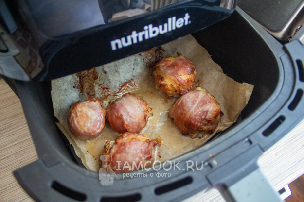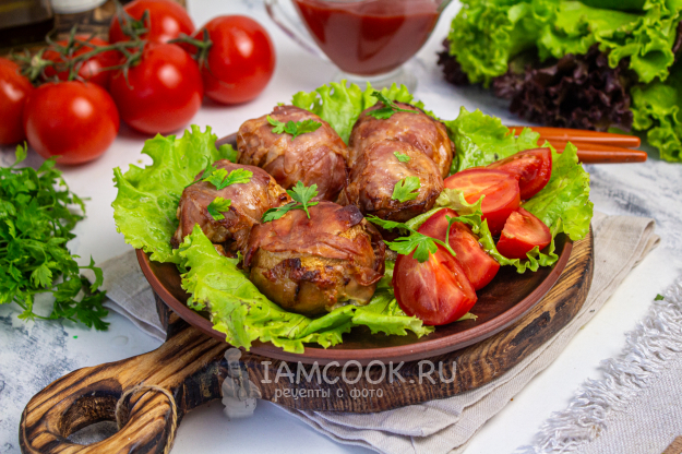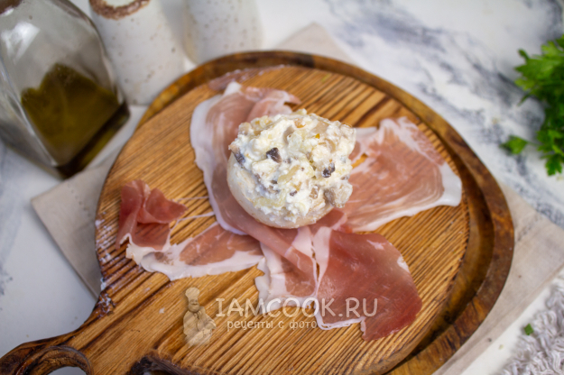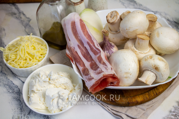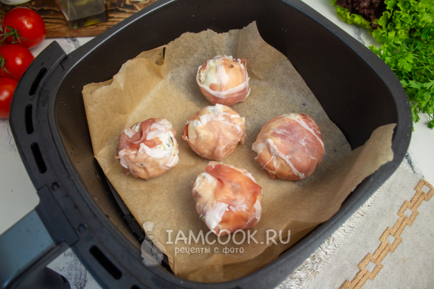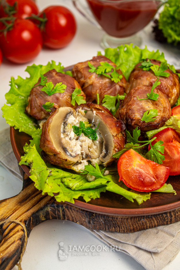 Разложите 2-3 полоски бекона крест-накрест, в середину положите нафаршированный гриб.