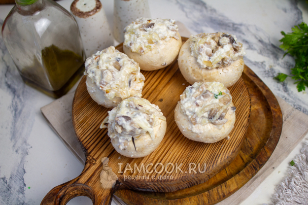 Подготовленной начинкой наполните шляпки шампиньонов. Я наполнила с верхом.