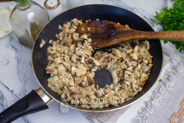 В сковороде обжарьте до мягкости мелко нарезанный лук и ножки грибов. Посолите и поперчите по вкусу.