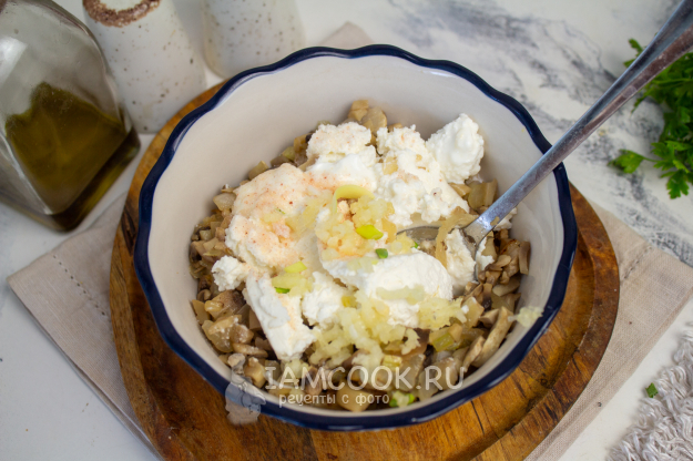 Обжаренные грибы немного остудите, переложите в подходящую посуду, добавьте творожной сыр, измельченный чеснок и соль.