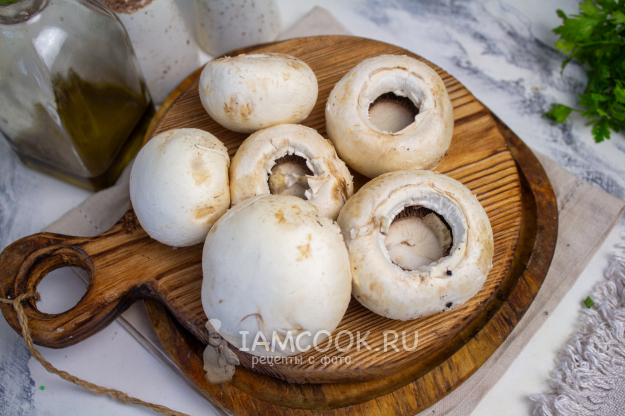 Шампиньоны очистите от загрязнений. Я стараюсь их не мыть под водой, а протирать влажной салфеткой. У грибов удалите ножки.