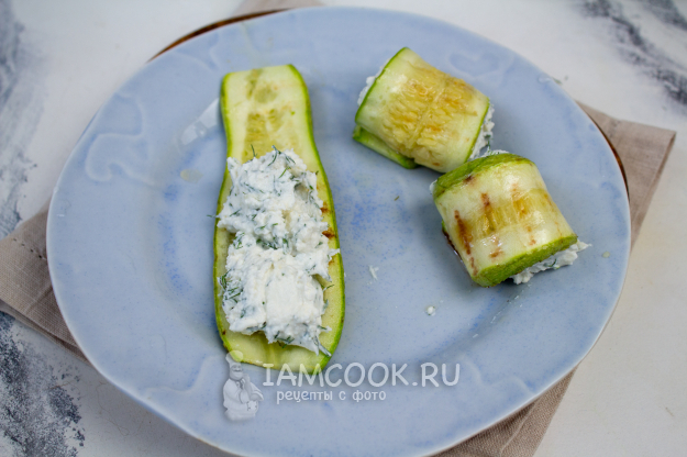 Полоску обжаренного кабачка смажьте подготовленной творожной начинкой и сверните рулетиком.