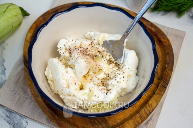 В подходящей посуде смешайте творожной сыр, сметану, измельченный чеснок. Посолите и поперчите по вкусу.