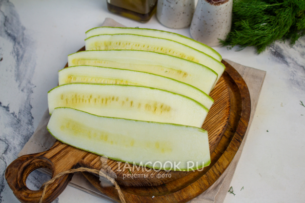 Кабачок помойте, обсушите и нарежьте вдоль на тонкие полоски.
