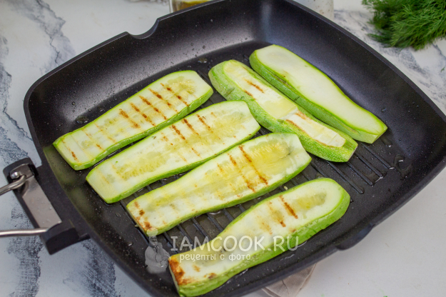 Обжарьте полоски кабачка на сковороде-гриль с небольшим количеством масла с двух сторон. Если нет сковороды-гриль, то жарьте на обычной.