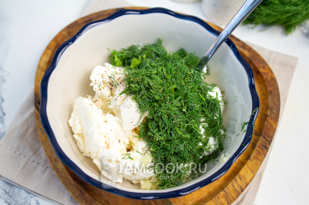Мелко нарежьте укроп и добавьте к творожной начинке, перемешайте.