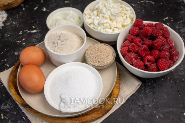 Соберите все необходимые продукты для приготовления творожной галеты в ПП варианте. Для теста использую цельнозерновую муку и псиллиум, а также нежирный творог. В качестве подсластителя у меня Эритритол. В начинку добавила малину, но можно взять любые ягоды или фрукты.