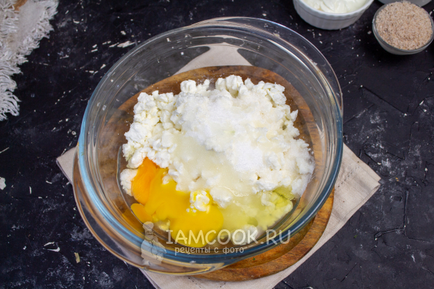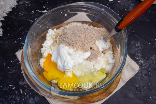 В миску выложите творог, добавьте яйца, соль, сахарозаменитель.