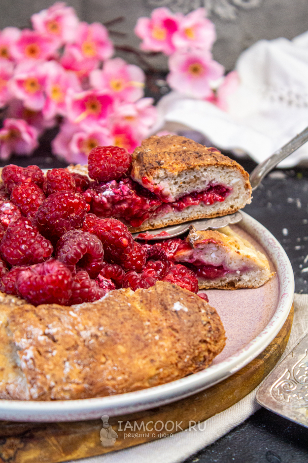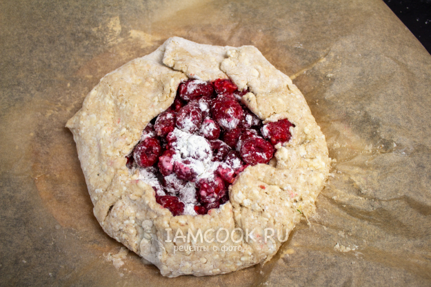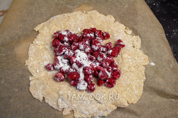 Разделите тесто на 2 равные части. Раскатайте одну часть прямо на пергаменте, в середину выложите малину и посыпьте кукурузным крахмалом.