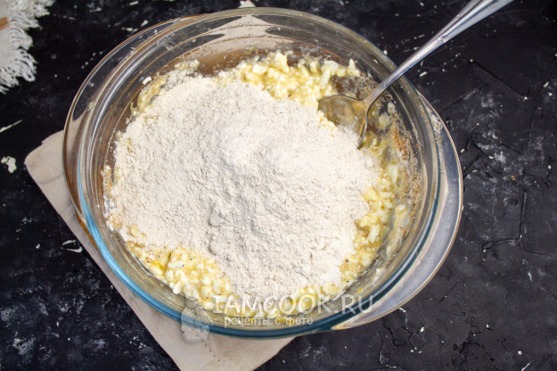 Всыпьте цельнозерновую муку и разрыхлитель.