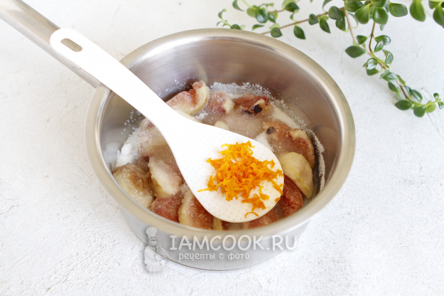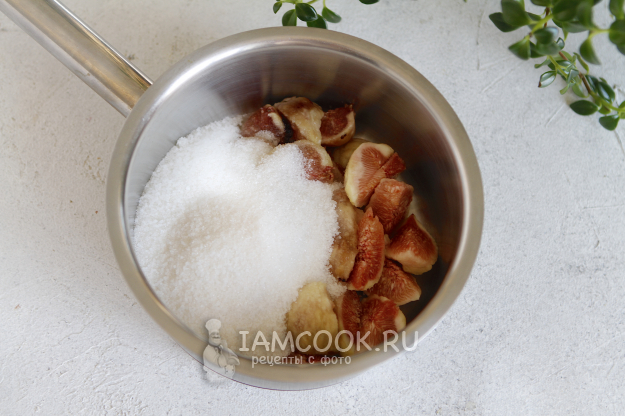 Подготовьте посуду с толстым дном. Переложите в нее инжир и всыпьте сахар. Оставьте инжир под сахаром примерно на 60 минут, пока инжир не даст сок.