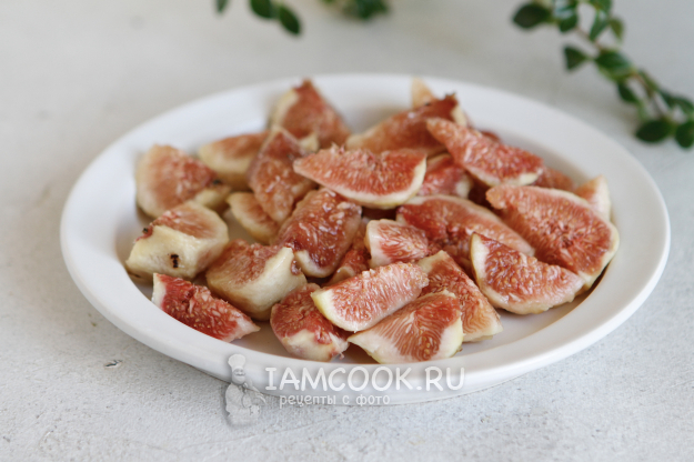 Промываем плоды инжира под проточной водой и аккуратно снимаем кожицу. В зависимости от размера плодов очищенный инжир нужно будет разрезать на 2 или 4 части.