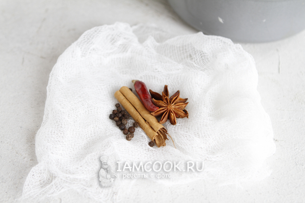 Подготовьте чистую марлю в 2-3 слоя. В центр уложить пол палочки корицы, бадьян, маленький перец чили целиком и пару горошин черного перца.