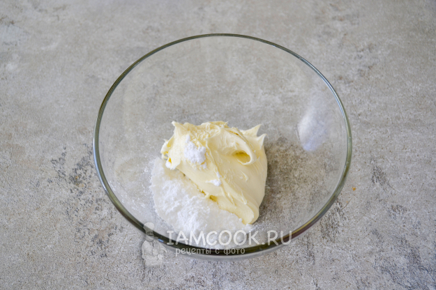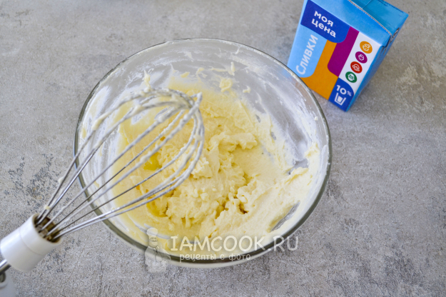 Взбейте сливки с сахарной пудрой. У меня оказались очень густые фермерские сливки, поэтому добавила немного сливок 10% жирности, чтобы взбитая масса получилась более нежной и воздушной.