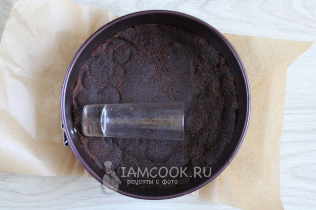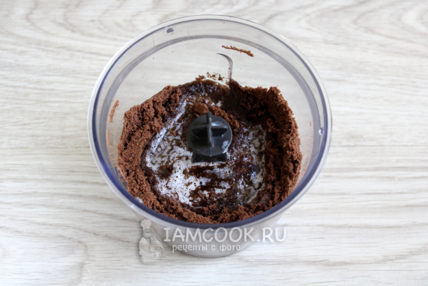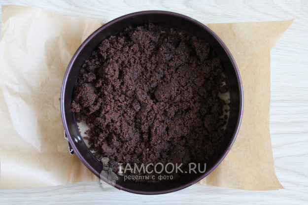 Для основы чизкейка измельчите шоколадное песочное печенье. Тщательно перемешайте его с растопленным сливочным маслом.