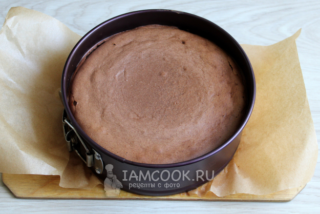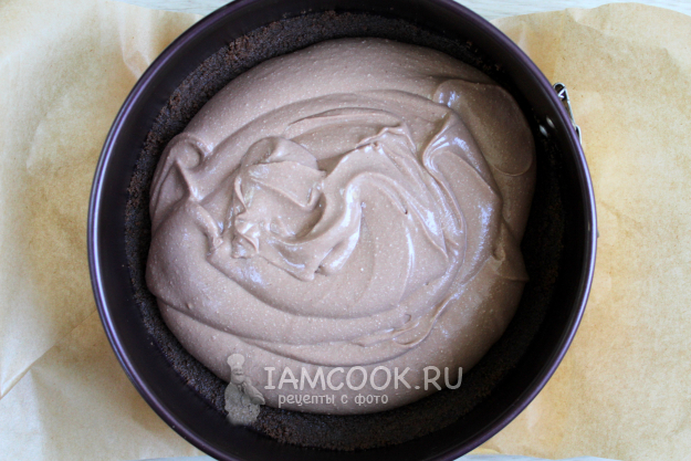 Осталось перемешать с жирными сливками, и начинка для чизкейка готова. В положенное время нужно достать песочную основу из духовки и вылить на неё шоколадно-творожную начинку.