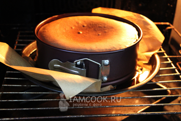 Убавьте жар до 150-160 градусов, поставьте на дно духовки глубокий противень с водой. Поместите форму с заготовкой чизкейка в духовку и запекайте в течение не менее 45 минут, а максимум - 1 час. Время зависит от свойств духовки. Советую половину времени запекать, укрыв форму фольгой.