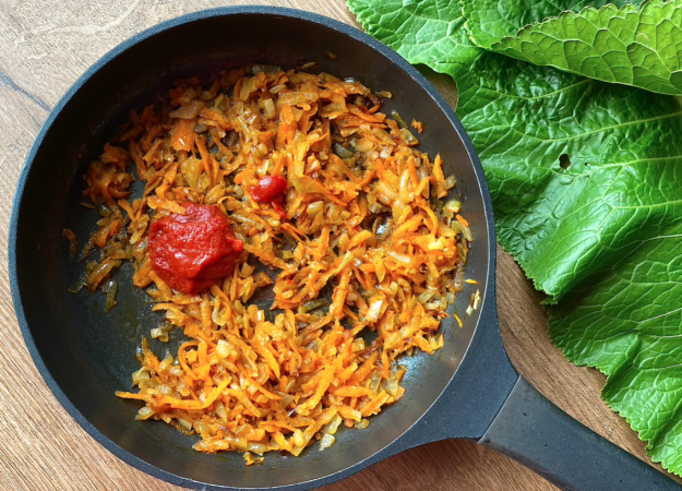 Добавьте 1 столовую ложку томатной пасты и слегка обжарьте.