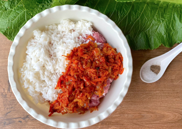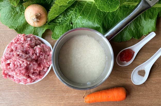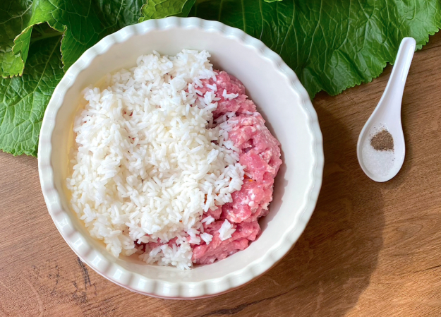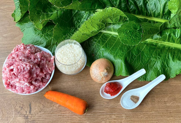 Подготовьте необходимые продукты для голубцов в листьях хрена.
