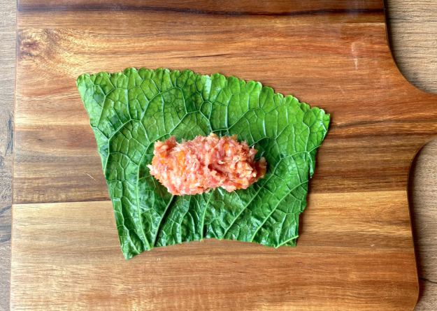 Нарежьте листья на части нужного размера, выложите порцию начинки.