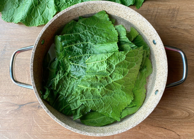 Опустите листья хрена в кастрюлю, залейте кипятком и оставьте минуты на 3. Чтобы вышло больше горечи, повторите этот процесс еще раз.