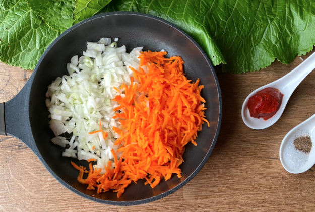 Нарежьте лук на кусочки, морковь натрите на крупной терке. Выложите в разогретую сковороду с маслом и обжарьте до мягкости.