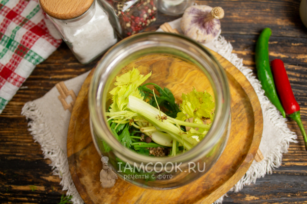 Банку простерилизуйте удобным для вас способом. Я стерилизую в микроволновке, а крышки кипячу на плите около 10 минут. В подготовленную банку добавьте свежую зелень, стебель сельдерея и специи. Я использовала семена кориандра, черный перец горошком, душистый перец и лавровый лист.