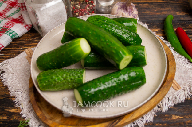Первым делом огурцы замочите в холодной воде на пару часов - так они впитают меньше маринада и не сморщатся. Затем тщательно помойте огурцы, и я срезаю у них попки (это не обязательно).