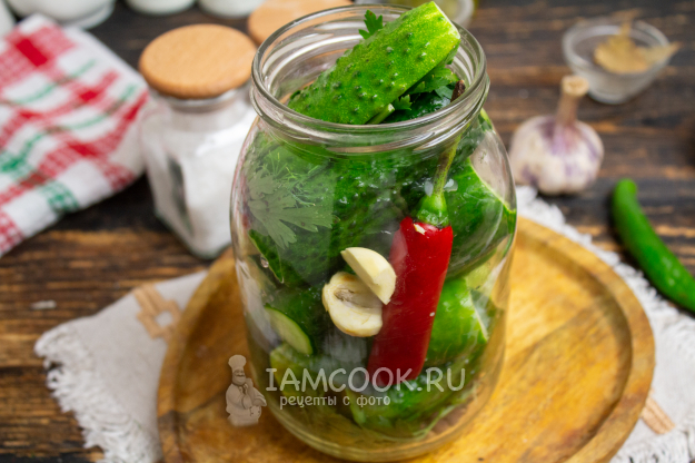 Чеснок очистите и нарежьте на пластины. Банку наполните плотно огурцами, также добавьте чеснок и стручок перца чили (по желанию).