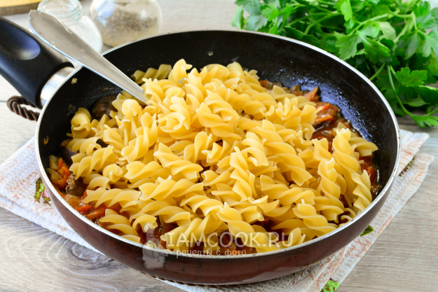 Затем всыпьте в сковороду сухие макароны, влейте еще немного воды.