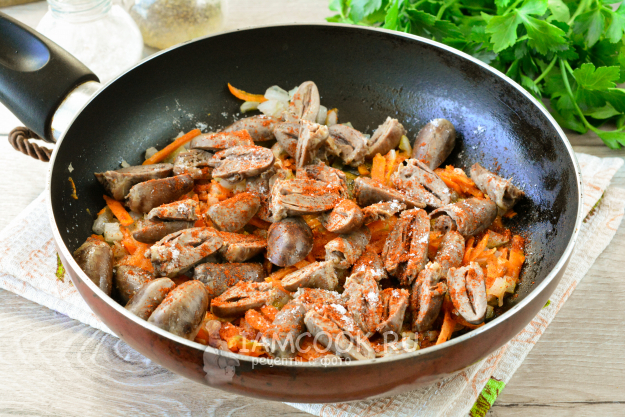 Пассеруйте лук с морковкой на сковороде с добавлением растительного масла, затем добавьте куриные сердечки. Сваренные сердечки очистите от пленок, разрежьте их вдоль и пополам. Перемешайте овощи с сердечками и жарьте все вместе еще пару минут. Добавьте еще немного соли, поперчите по вкусу, всыпьте сладкую паприку.