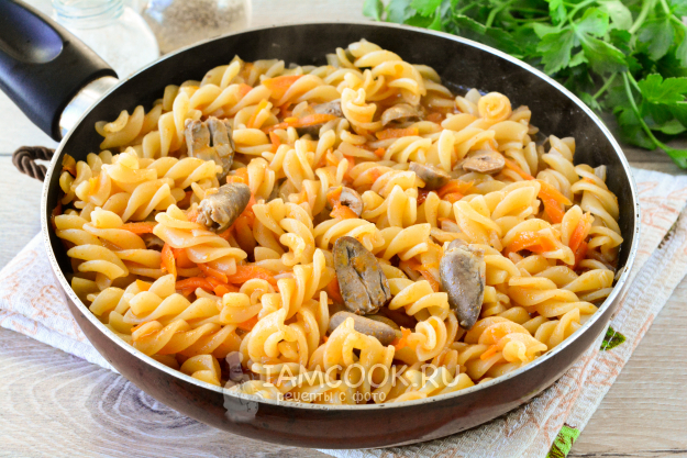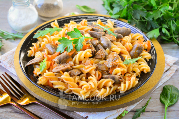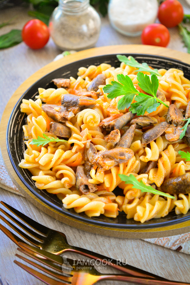 Тушите макароны с куриными сердечками 15 минут под крышкой на медленном огне, иногда помешивая. Блюдо готово!