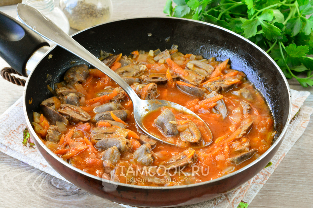 Томатную пасту разведите в 250 г воды, соус влейте в сковороду. По желанию соус подсолите. Тушите сердечки еще 5-7 минут на небольшом огне.