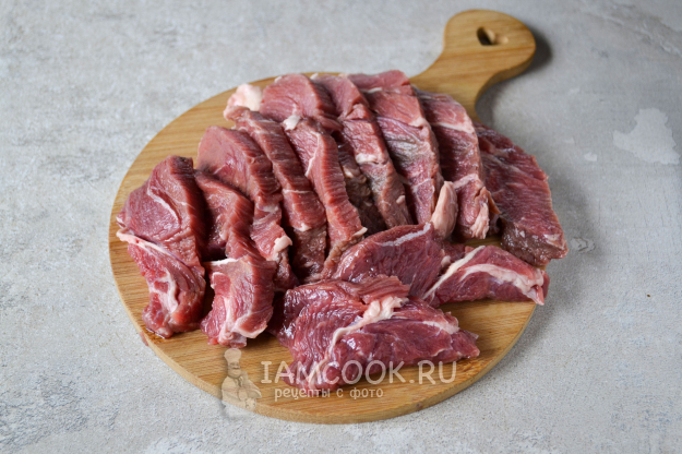 Мясо вымойте, обсушите. Нарежьте мясо на куски толщиной примерно 1 см поперек волокон.