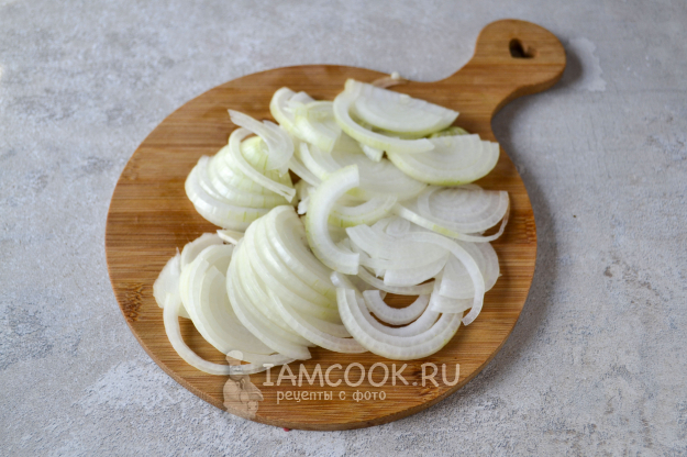 Крупную луковицу почистите, нарежьте тонкими полукольцами.