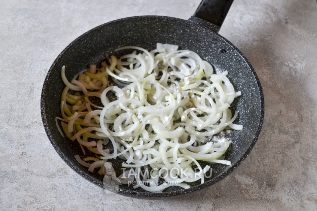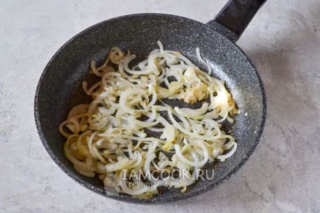 Перемешайте, жарьте лук до легкого золотистого цвета, помешивая.