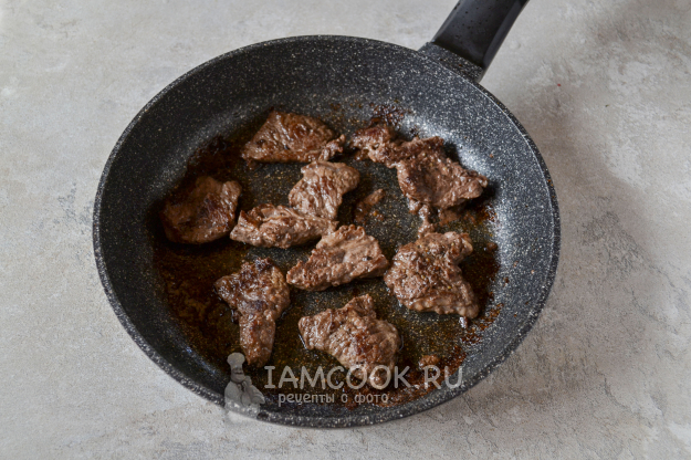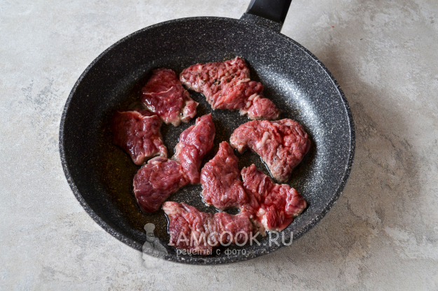 Разогрейте сковороду с растительным маслом, положите подготовленные куски мяса. Первые пару минут жарьте мясо на сильном огне, затем огонь уменьшите до среднего. Жарьте 3-4 минуты.