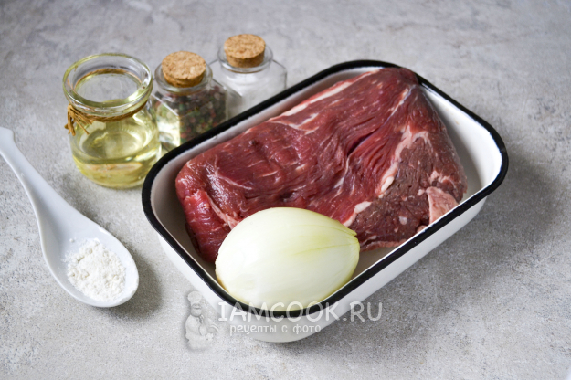 Продукты для приготовления бифштекса по-деревенски с луком на сковороде - перед вами.