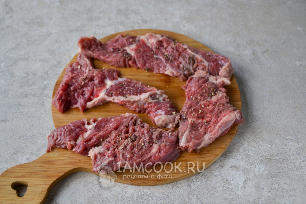 Слегка отбейте каждый кусок мяса с обеих сторон, поперчите, перец вотрите в мясо.