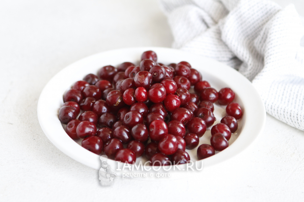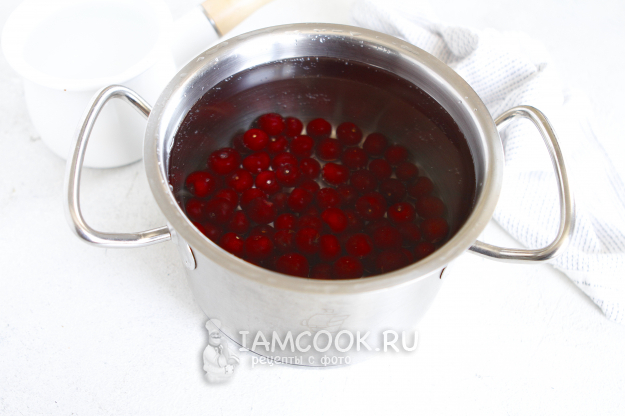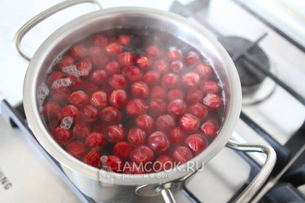 Отправляем вишню в кастрюлю с прохладной водой. Я использую бутилированную воду, подойдет и кипяченая. Если вы уверены в качестве воды из-под крана, то смело добавляйте ее.