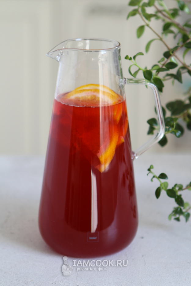 Перекладываем апельсиновые дольки в графин и добавляем только вишневый сок, без ягод.
