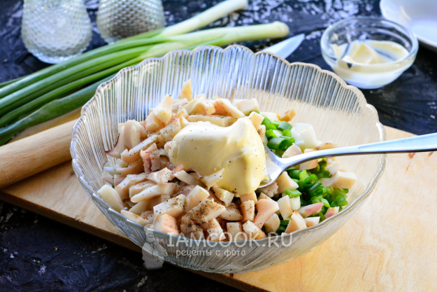 Сваренные кальмары нарежьте небольшими кубиками (кусочками) и всыпьте в салат.