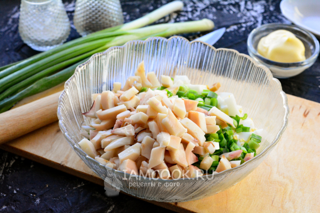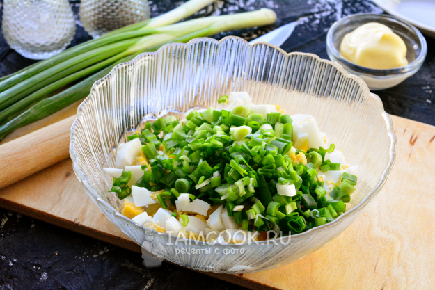 Пока кальмары остывают, сполосните зеленый лук, нарежьте мелкими колечками и выложите его в салат.