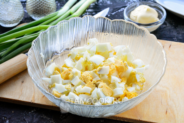 Куриные яйца заранее сварите вкрутую, варите их 8 минут в кипящей воде, затем остудите и почистите. Яйца нарежьте кубиками и переложите в салатник.