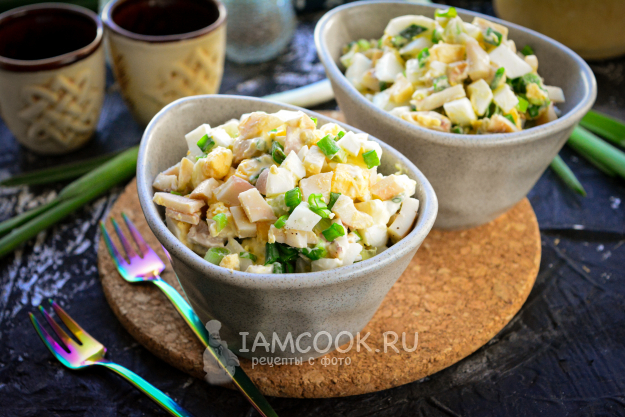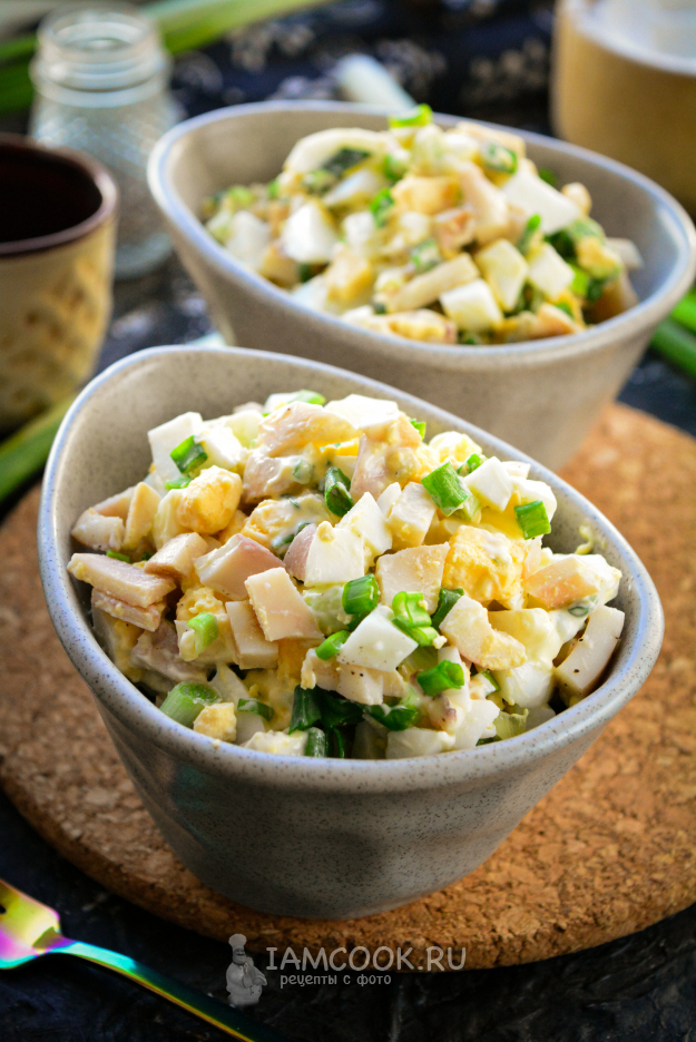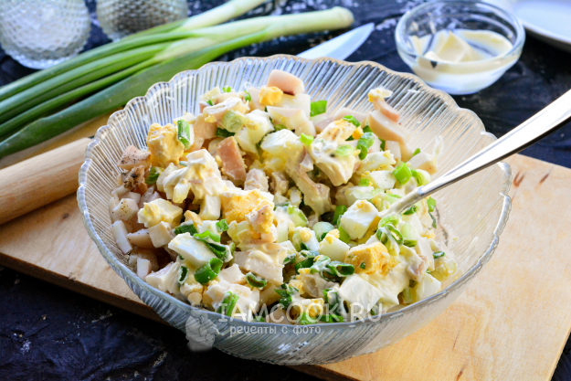 Готовую закуску подавайте к столу. Салат с кальмарами, яйцом и зеленым луком получается сытным и вкусным!