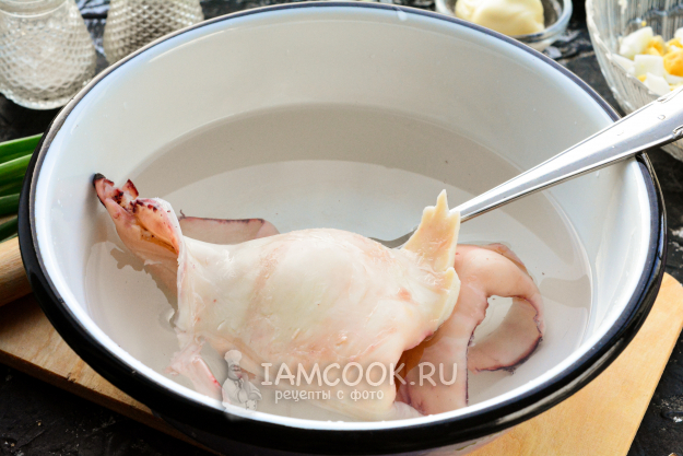 Кальмары тщательно промойте, удалив внутренности, выложите в кипящую воду и варите 1 минуту. Затем достаньте из воды и остудите.