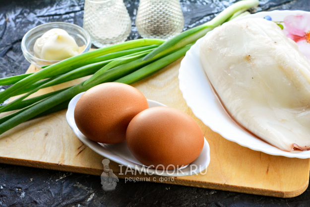 Соберите все продукты для приготовления салата с кальмарами, яйцом и зеленым луком.