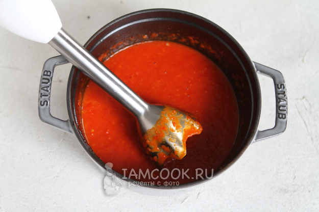 В процессе варки джем значительно уменьшится в объеме, так как выкипит практически вся жидкость. Содержимое пробиваю блендером и вновь отправляю на плиту. Я не планировала добавлять пектин для загустения, поэтому продолжаю варить джем еще примерно 30 минут, регулярно помешивая.