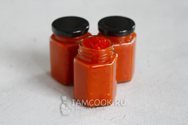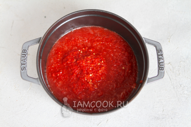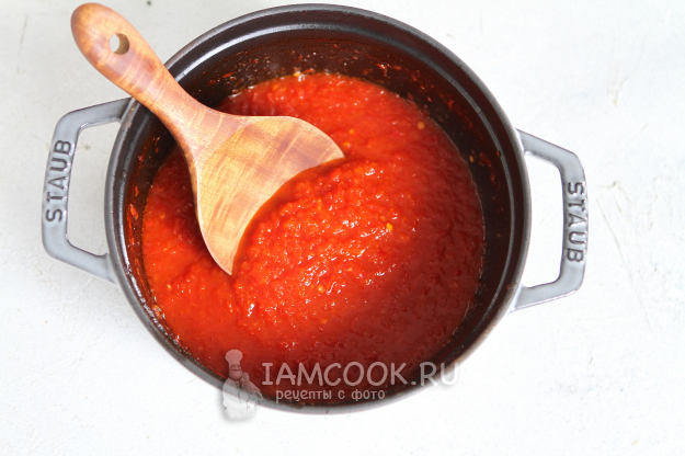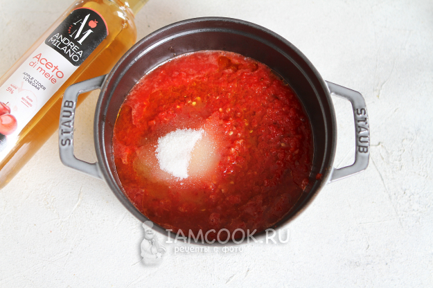 Добавляем яблочный уксус, перемешиваем перечную массу до растворения сахара и отправляем содержимое кастрюли на плиту. На умеренном огне доводим содержимое до кипения и убавляем огонь. Кастрюлю не закрываем крышкой, варим на самом медленном огне 90 минут.