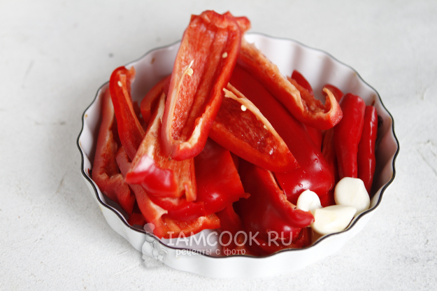 Подготовьте 2-3 зубчика чеснока, не более. Болгарский перец очистите от семян и нарежьте. А вот у перца чили мы удаляем только хвостик. Если вас смущает этот момент и с острым вы не особо "дружите", то в таком случае семена лучше удалить полностью. Острота в любом случае останется, но ее будет в джеме значительно меньше.